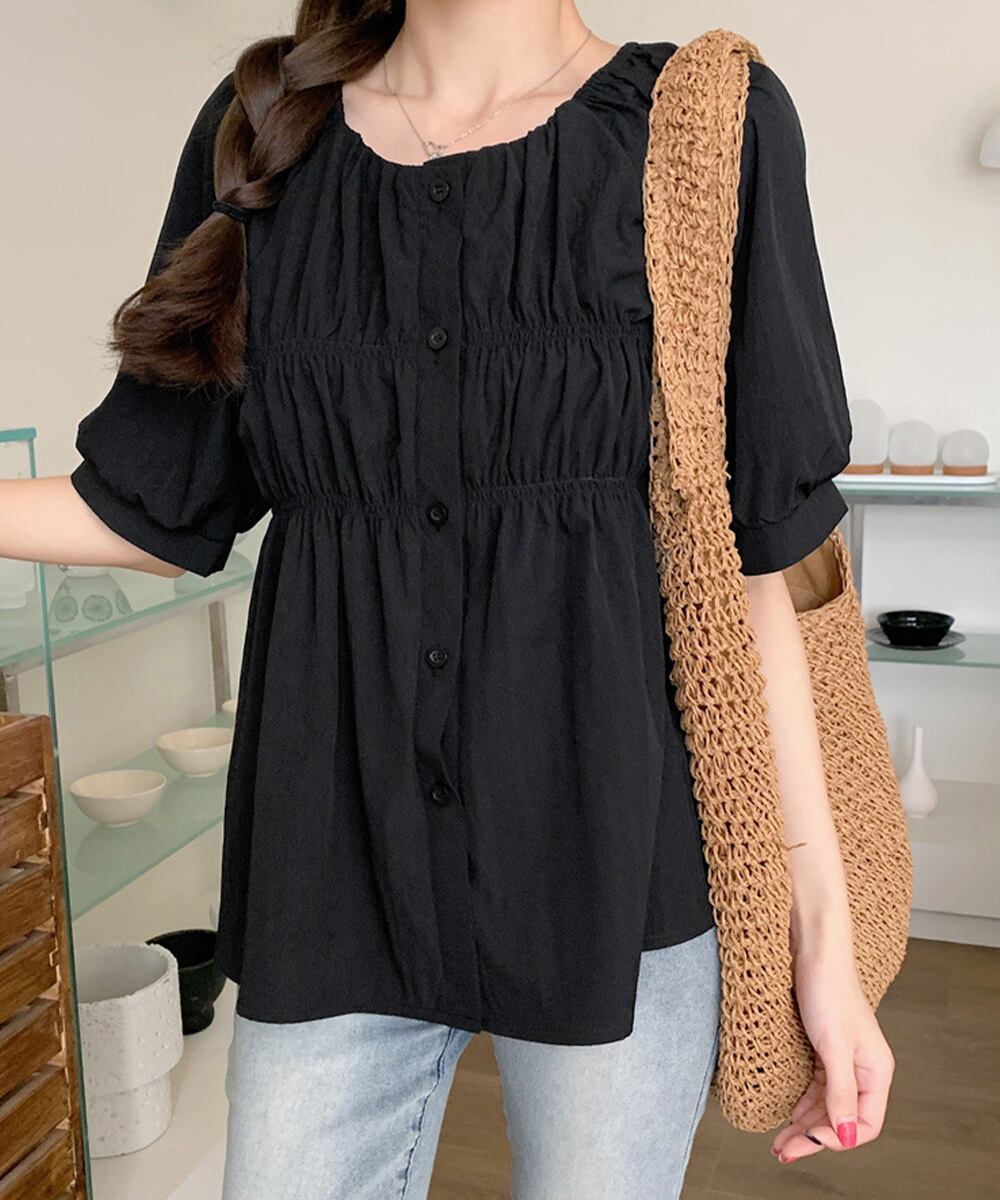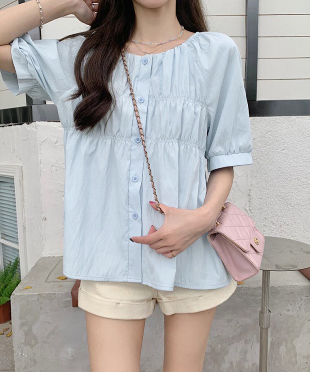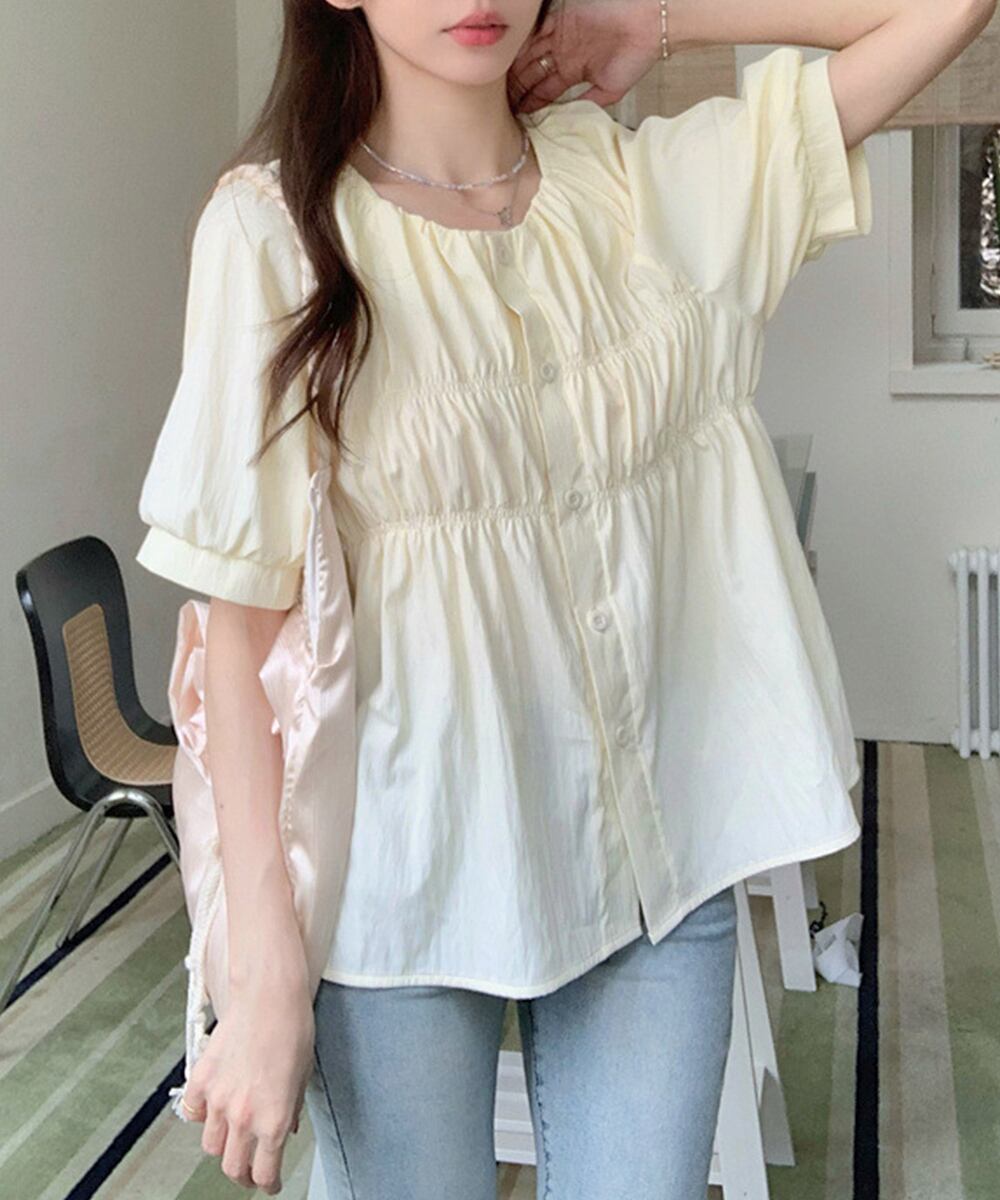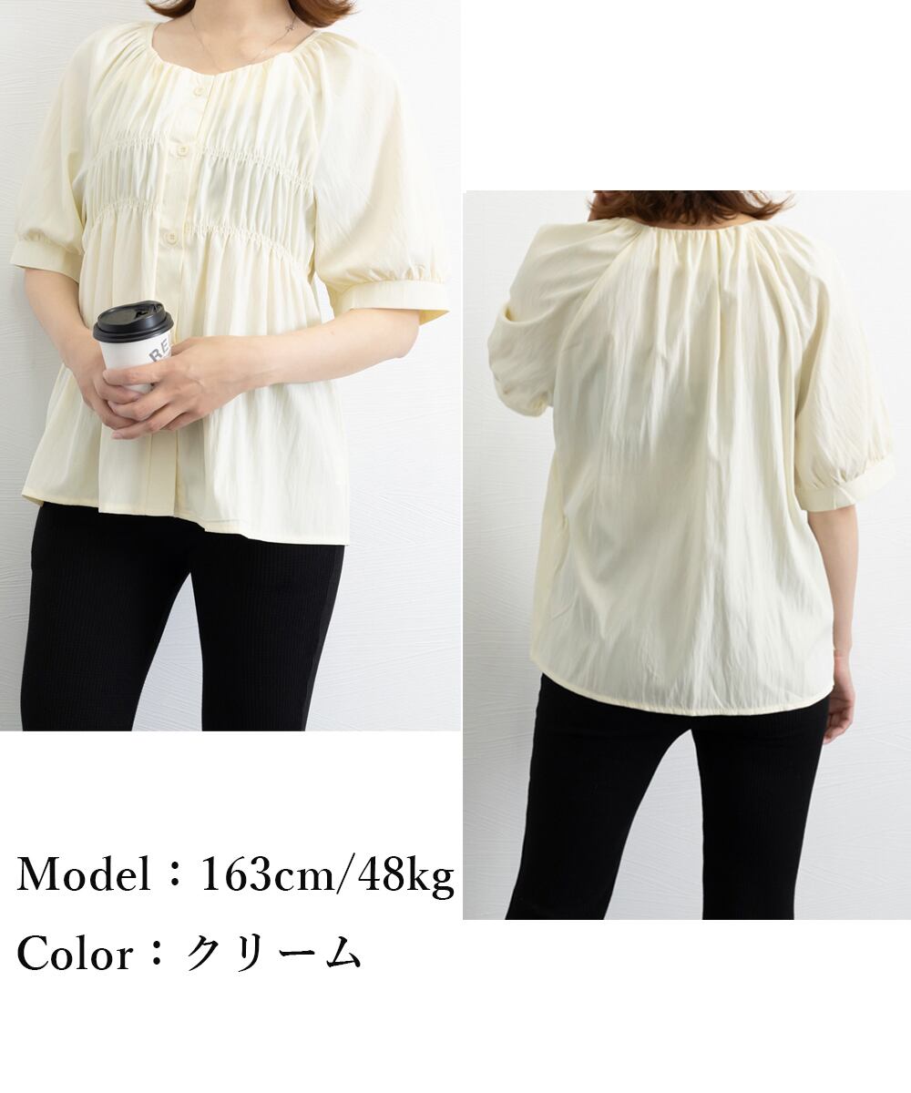 女性らしさが際立つフェミニンなシャーリング半袖ブラウス