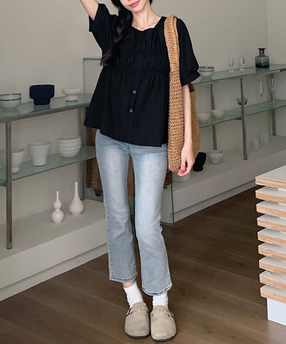 パフ袖ブラウス 黒 カジュアルきれいめ 韓国ファッション夏