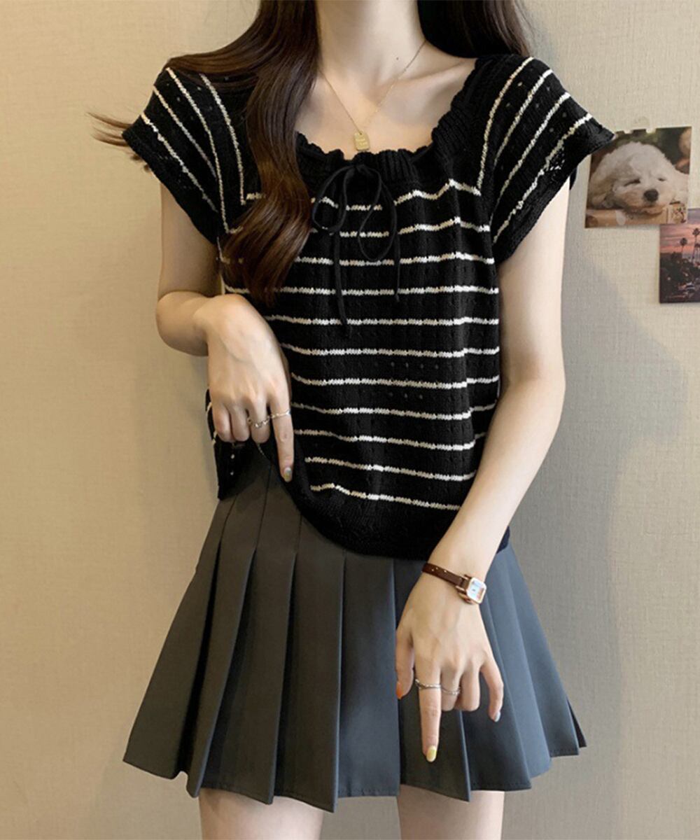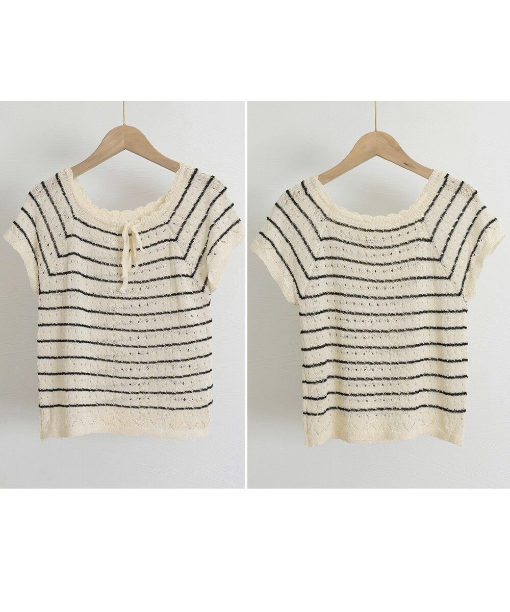 【日本倉庫即納】 パンチングリボン半袖ニットトップス韓国風
